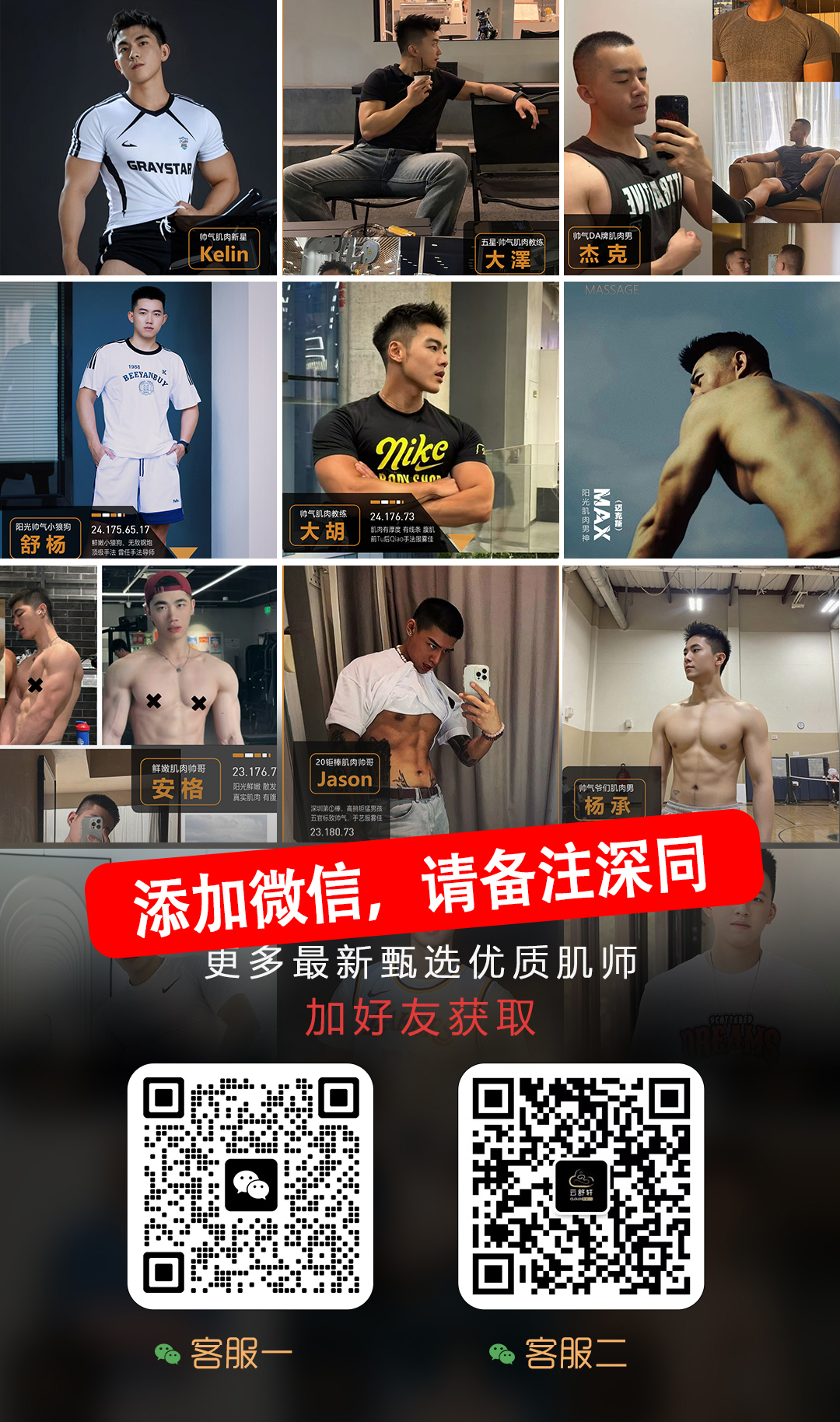 一个深圳优质技师的聚集地,以肌肉男、小狼狗、奶狗为主。每个技师都有其独特长处,服雾用心稳靠